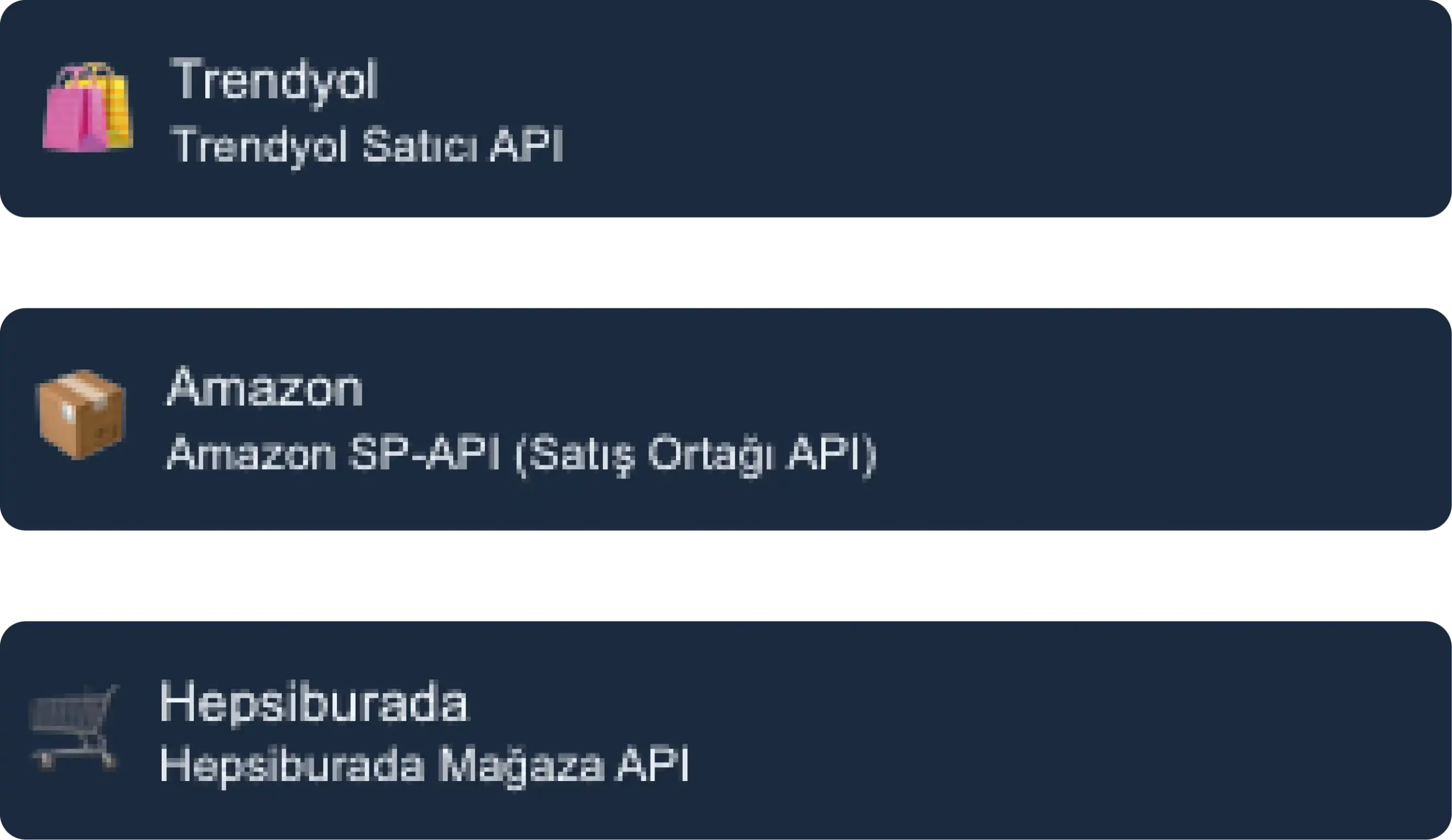 Farklı satış kanallarınızı tek panelden yönetmenizi sağlayan hızlı, güvenilir ve tam uyumlu pazaryeri bağlantıları sunar.
